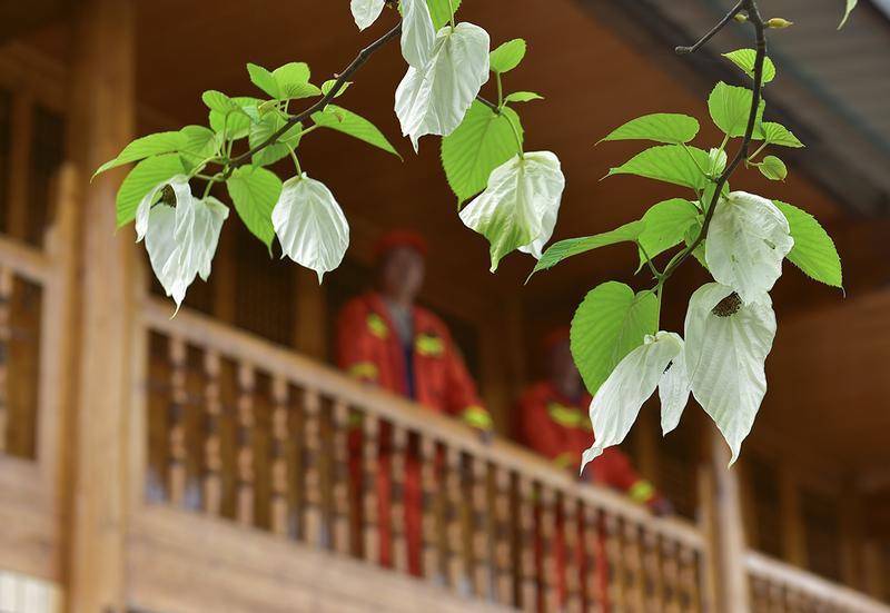 林场职工在住处观看珙桐花。