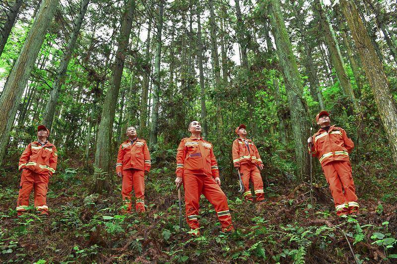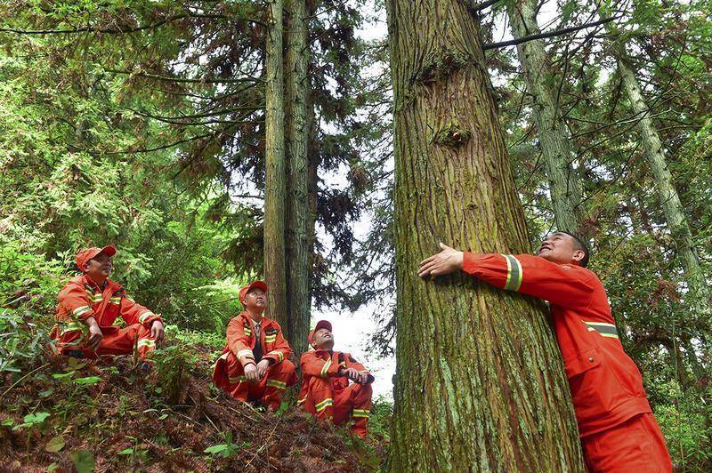 沿着巡山路下去,珙桐林边上长着一棵棵被他们叫做“树妈妈”的杉木树。那树一看就是年代很久远了。李万江走到一棵树下,张开双臂,用力抱了抱树。他说:“这棵树我来时才小腿粗,现在完全抱不住了。”